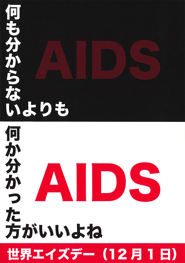 世界エイズデー(12月1日)啓発キャンペーン ホーム - 啓発キャンペーン - 世界エイズデー(12月1日) - 年度別ポスターコンクール - 令和7年度 審査結果 - 一般の部 入賞者 小学生・中学生の部 高校生の部 一般の部 入賞者 - 一般の部 画像をクリックして拡大できます。 最優秀賞 伊藤 優希さん横浜市立大学 . 優秀賞 井上 瀬菜さん大阪モード学園 田村 貞夫さん . 佳作 瀬川 莉央さん大阪モード学園 大谷 博之さん 阪東 聖華さん大阪モード学園 . ポスターコンクール審査結果トップページに戻る