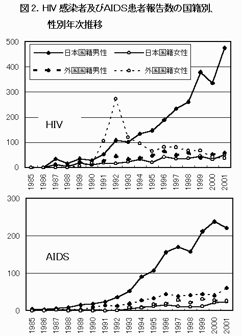 HIV感染者の報告数は、1996年以降増加を続け、2001年は過去最高の報告数(621件)となった(図1)。HIV感染者の増加は、日本国籍男性の増加が中心であり、日本国籍女性も緩やかな増加傾向にある(図2)。