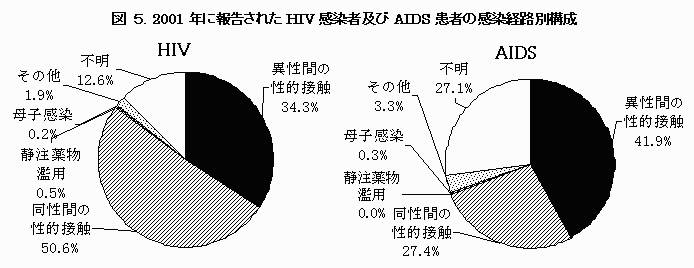 感染経路は、HIV、AIDSともに性的接触による感染が大半であり、静注薬物濫用や母子感染によるものはいずれも1%以下にとどまっている(図5)。しかし、静注薬物濫用による感染の拡大は極めて急速であるため、引き続き監視が必要である。