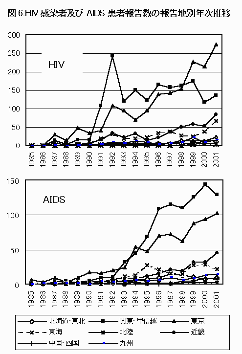 報告地は、東京、その他の関東・甲信越ブロックが依然多く、2001年報告例ではHIV感染者の66.0%、AIDS患者の69.6%を占めている。また、HIV感染者は北陸を除く全てのブロックで増加し、特に東京、近畿、東海ブロックでの増加が目立った。AIDS患者では東京、近畿ブロックで増加していた(図6)。